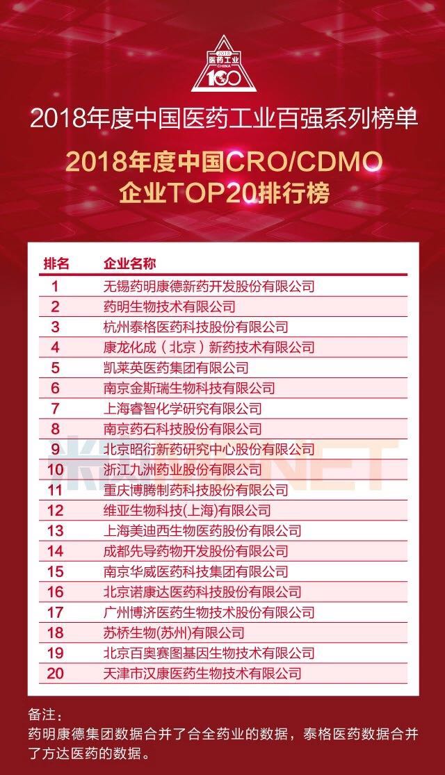 在2018年度中國CRO(含CDMO)企業TOP20排行榜中,藥明康德、藥明生物、泰格醫藥位列前三甲。